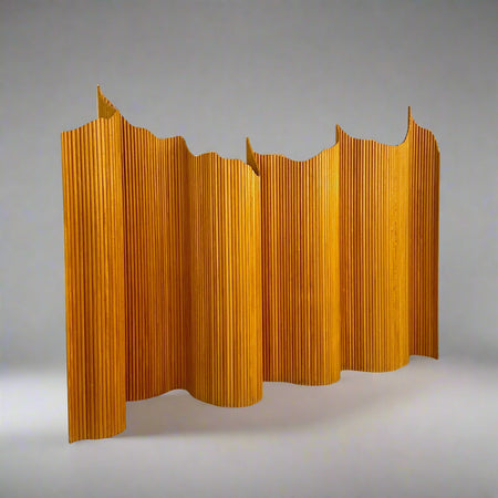 Cherrywood Italian Modernist tambour screen/ room divider. Beautiful interior design element crafted from vertical cherrywood slats that can be rolled up and opened in numerous dynamic curved positions.