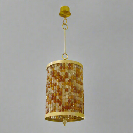 A Contemporary Modernist Lantern designed by Roland Wolff. Crafted in gilt bronze with Hand-Blown Murano Crystal Beads of Opaline, Topaz, Amber, Rose, and Garnet. With matching canopy and arm.