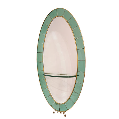 Cristal Arte large scale oval floor mirror model #2690. A frame of beveled, colored, crystal glass is outlined by brass filet.  A thick clear polished glass shelf is mounted in the lower third of the mirror. It rests on a stylized scrolled brass base.