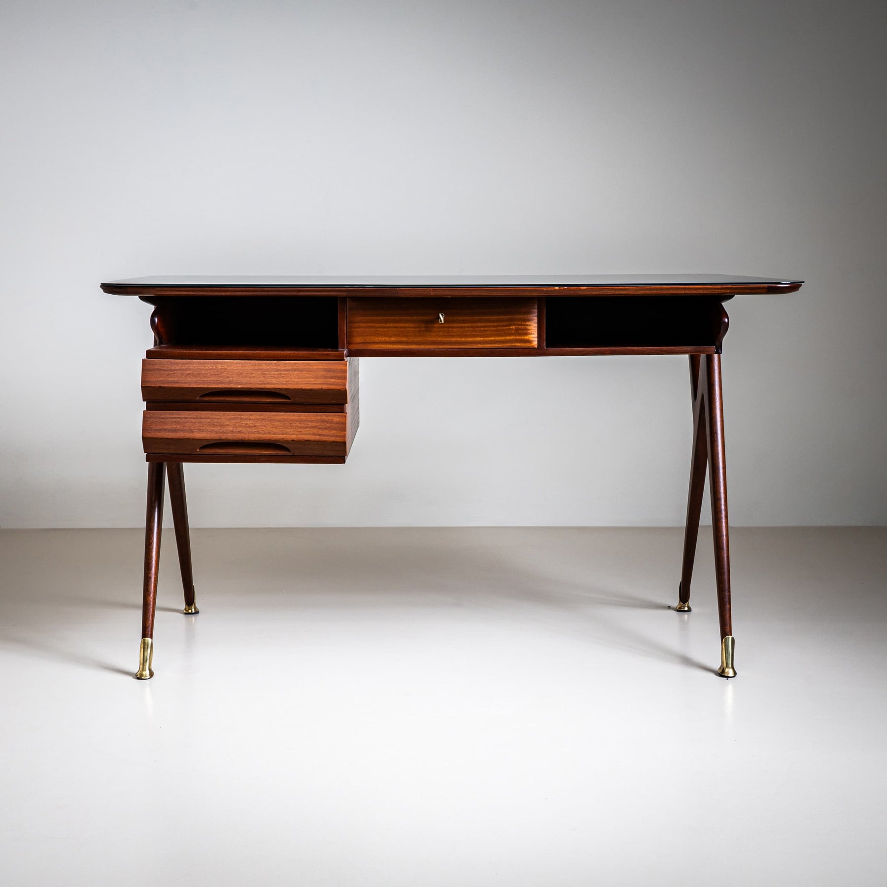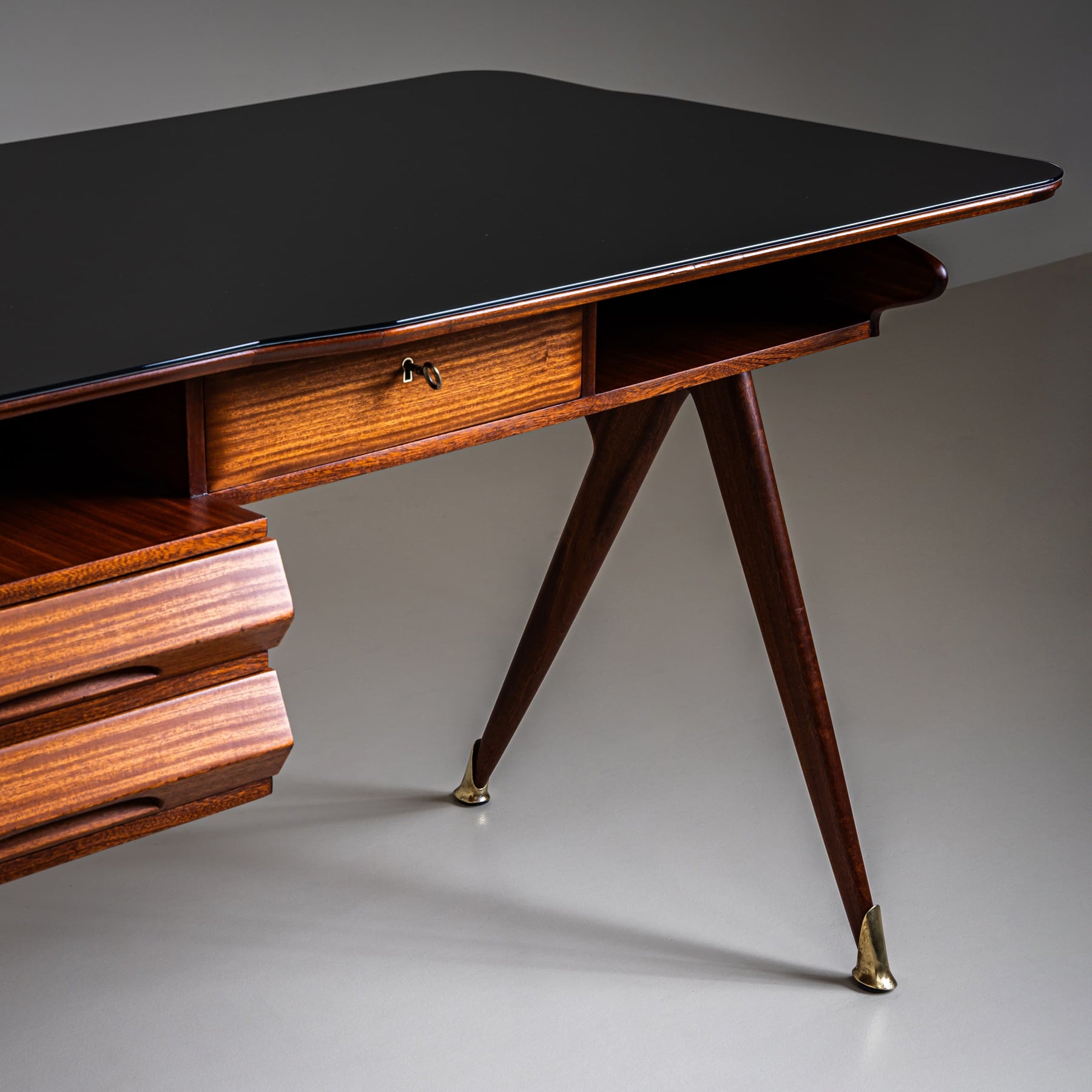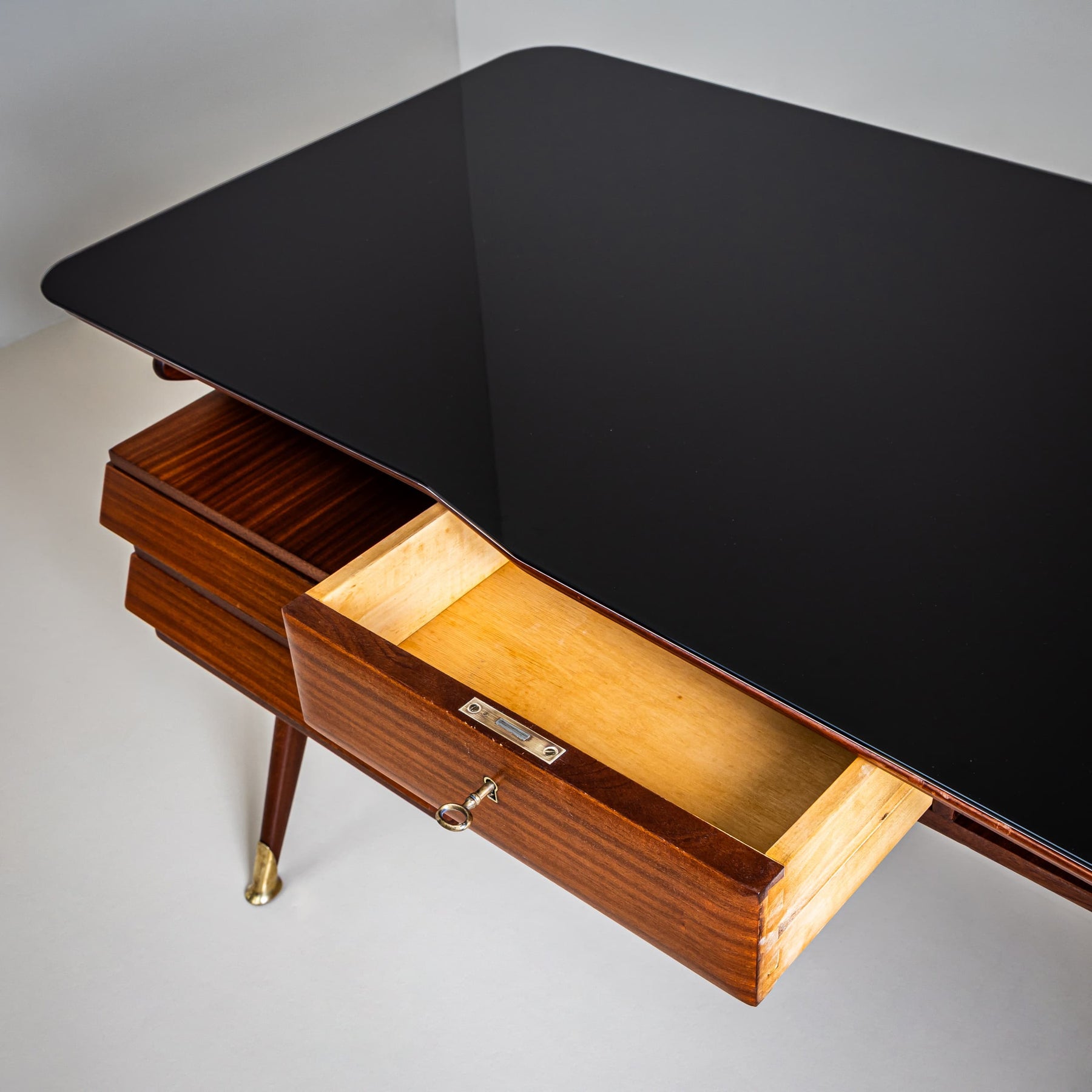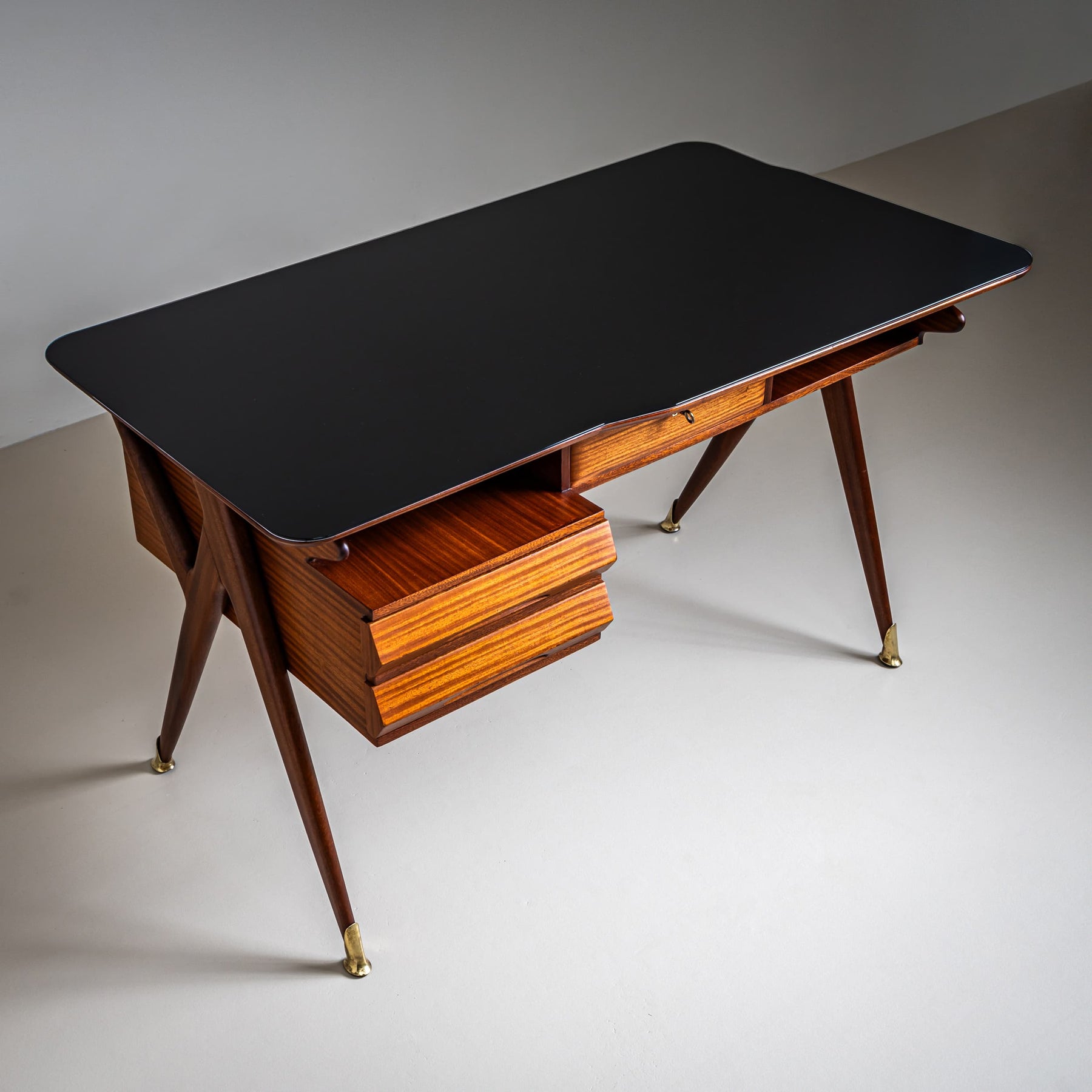 Asymmetrically designed desk standing on slender, forked legs fitted with brass sabots. The left side features two drawers, above which are two open shelves and one lockable drawer. The desk is veneered in mahogany. The rounded top is finished in black and protected by a glass inset.