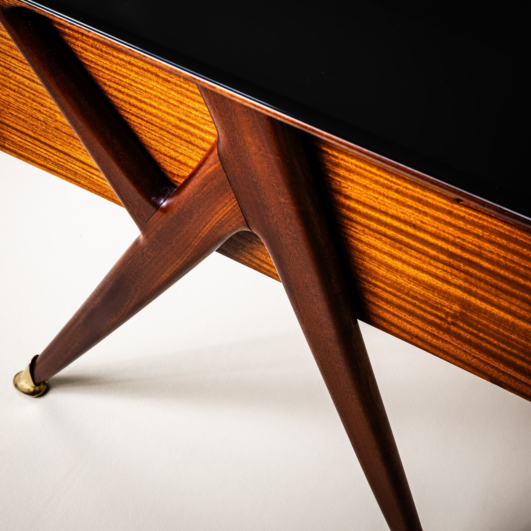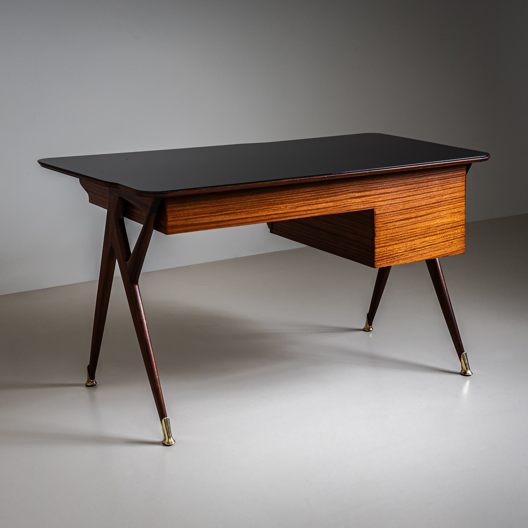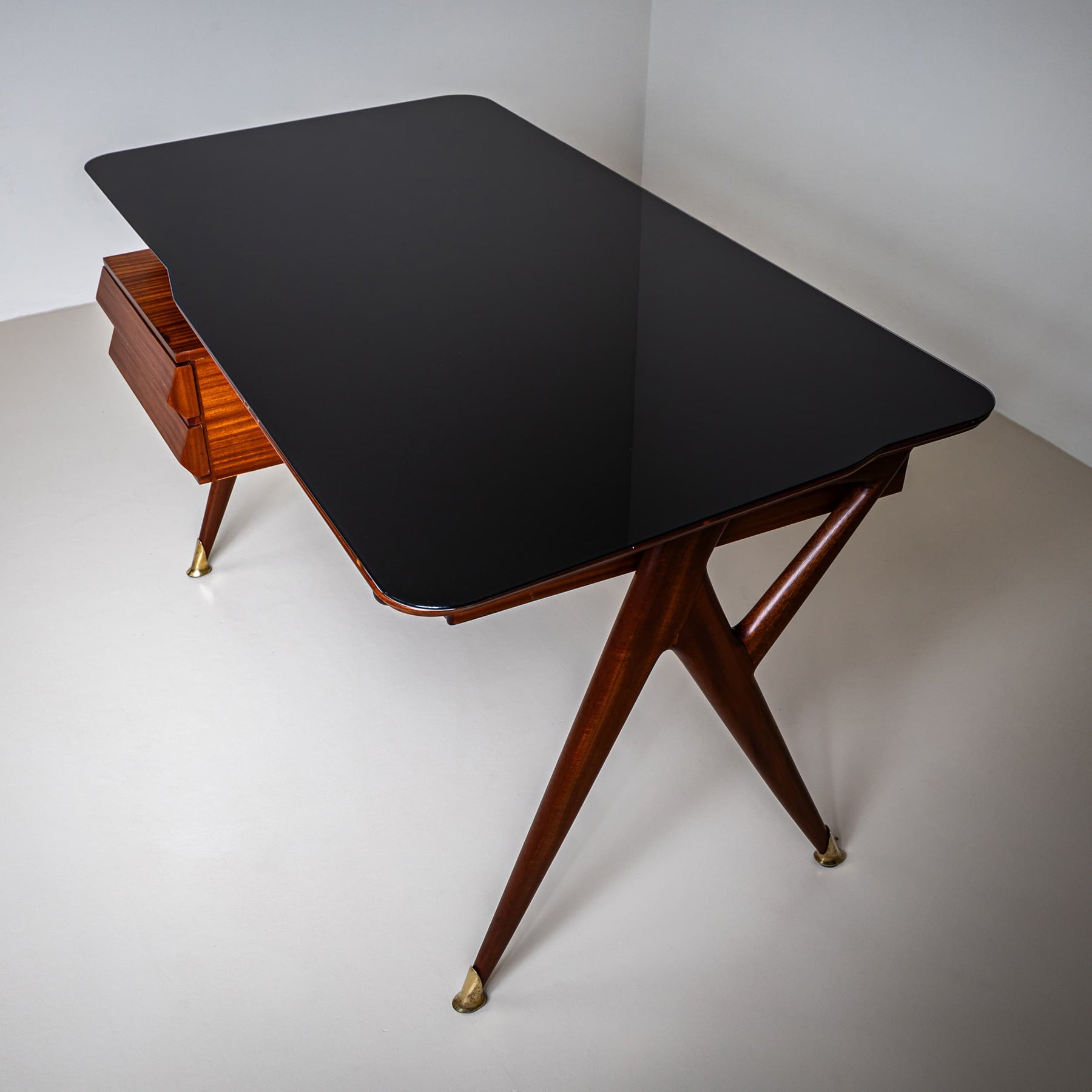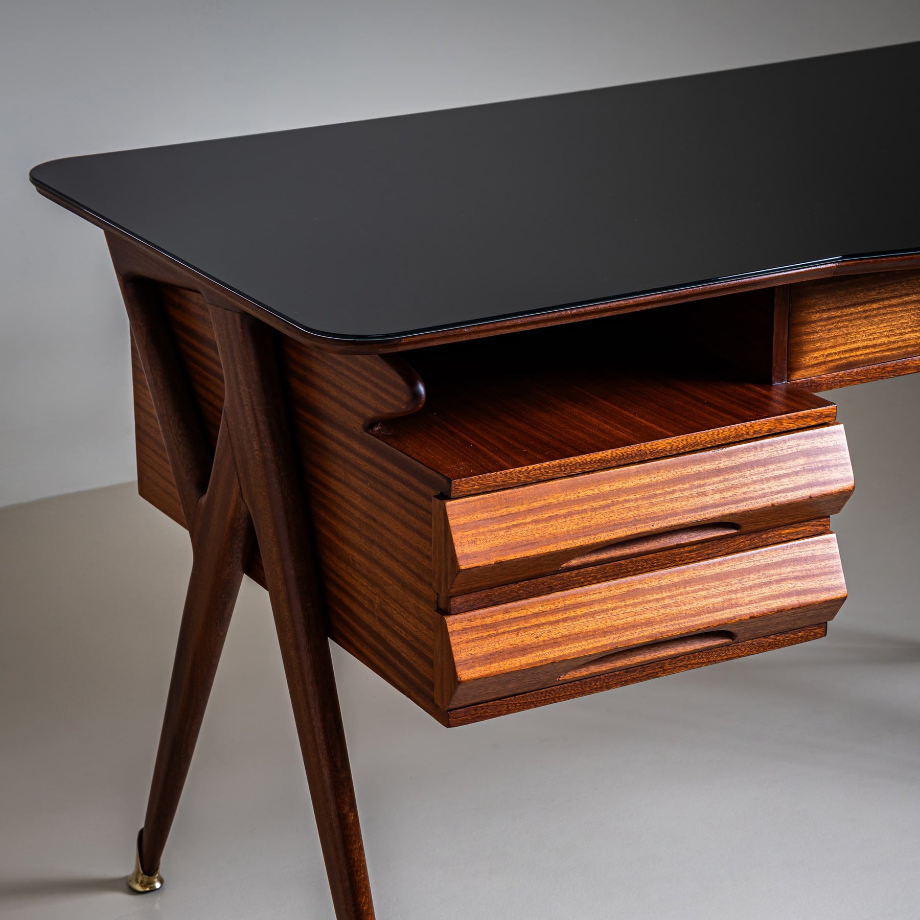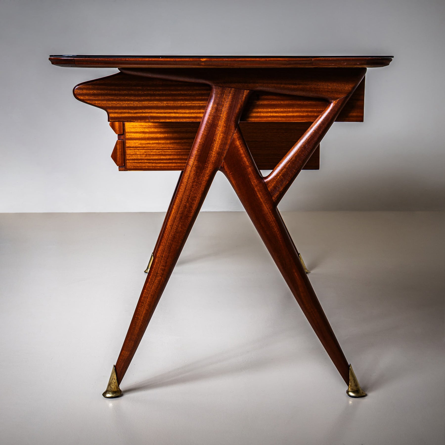 Asymmetrically designed desk standing on slender, forked legs fitted with brass sabots. The left side features two drawers, above which are two open shelves and one lockable drawer. The desk is veneered in mahogany. The rounded top is finished in black and protected by a glass inset.