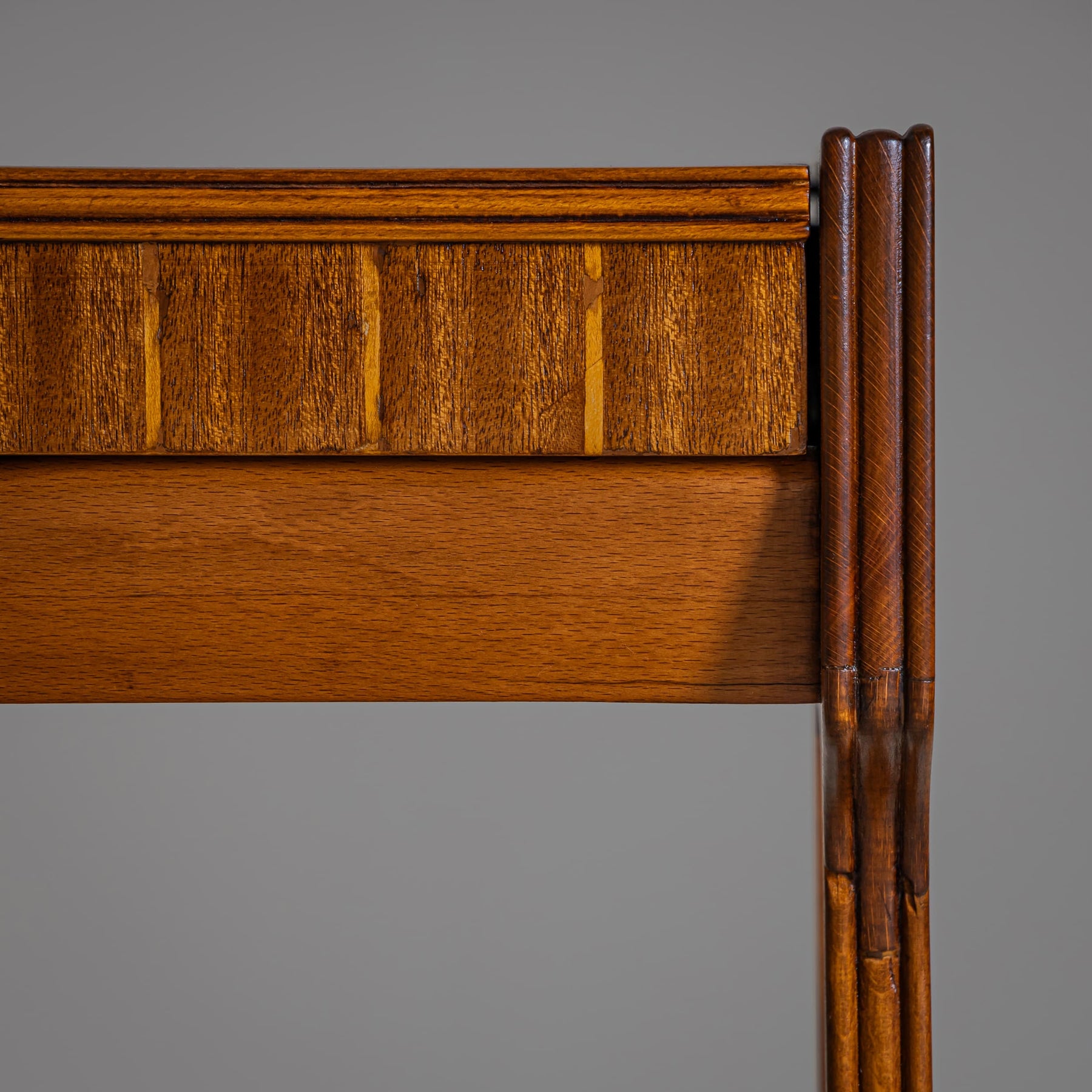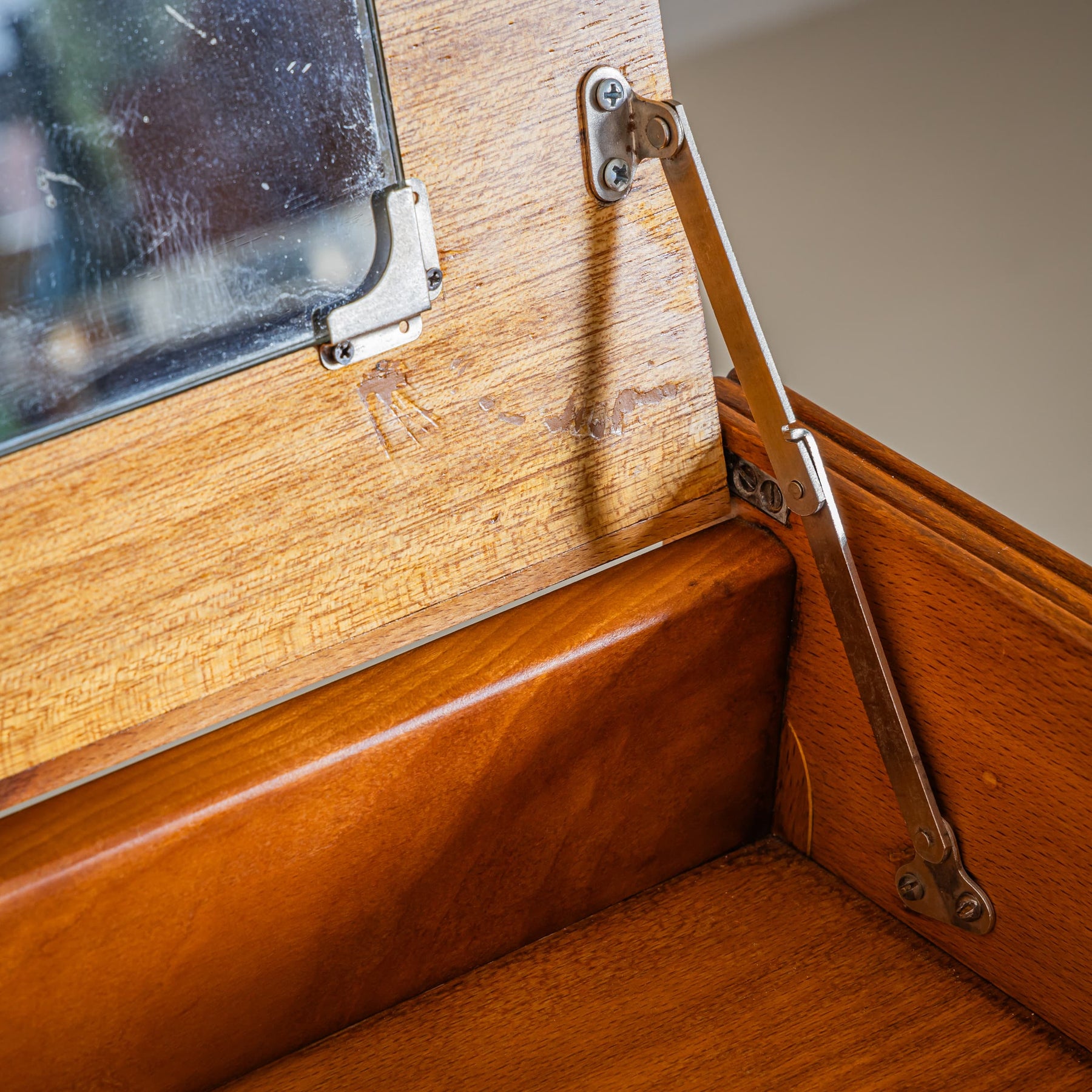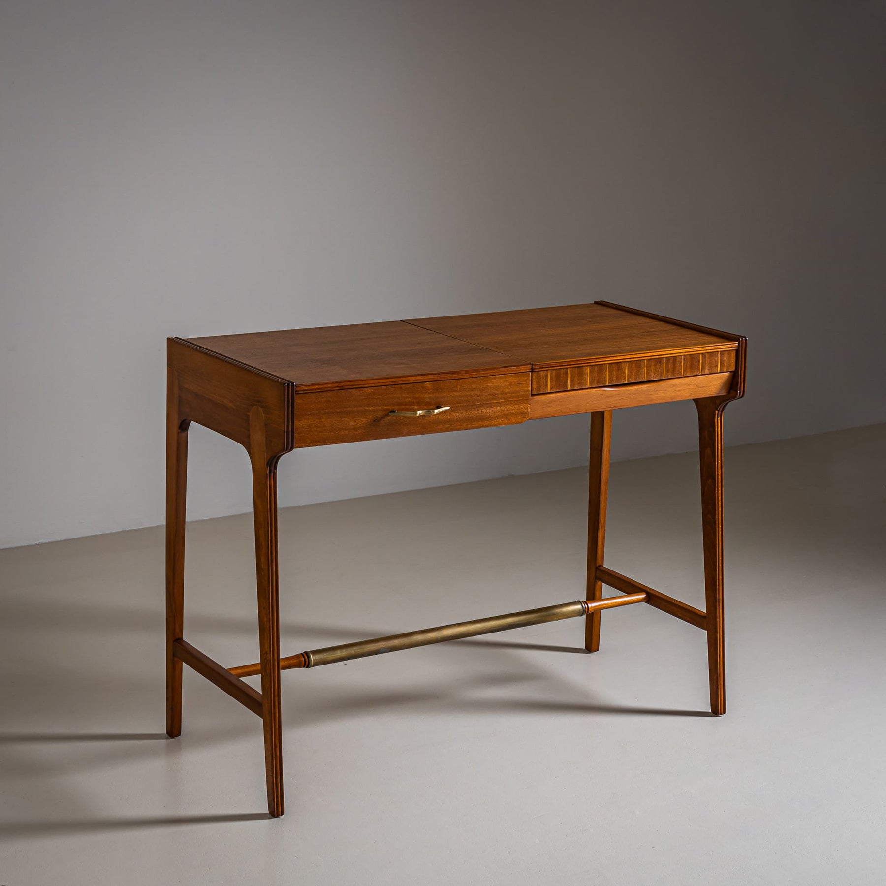 Dressing table with a drawer on the left side and a lift-up compartment with mirror on the right. The slightly splayed straight legs are joined at the center by a circular wooden and brass stretcher. The piece has been meticulously polished, enhancing the beauty of the wood grain.