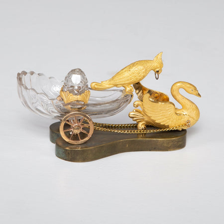 Small showcase object of a chariot with a cockatoo, which is pulled by a swan. An egg-shaped case is mounted on the cut glass chariot. Bronze, partly fire-gilded.