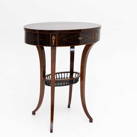 Empire sewing table with socketed saber legs and a basket tray, adorned with an oval frame featuring fire-gilded fittings. The table includes a lockable drawer with diamond-shaped fields, embellished with vine-shaped inlays and delicate ink painting.