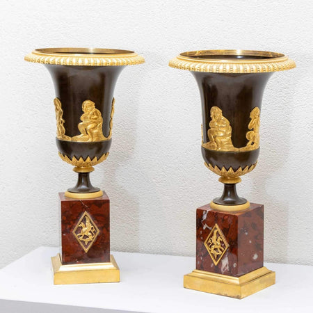Pair of Empire vases on red marble plinths with fire-gilt bronze fittings in the shape of small satyrs and putti. (measurements plinth: 10x10 cm)