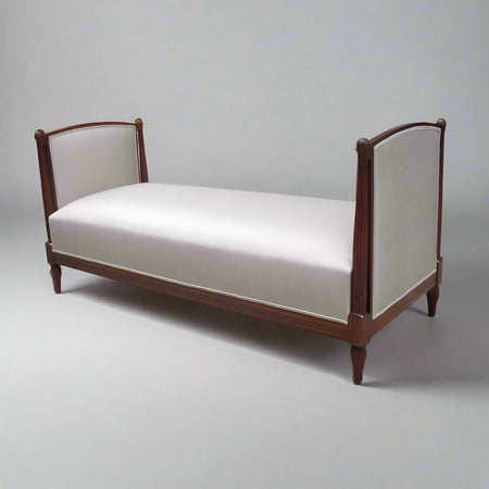A fine Art Deco daybed. Mahogany with fluted leg details and fruitwood inlay details around the base.