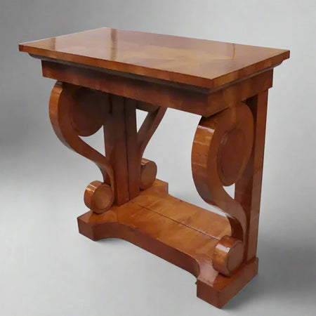 A fine Biedermeier console. Cherrywood with mirrored back panel.