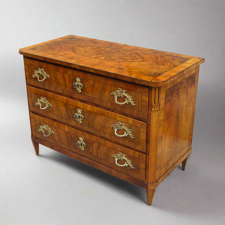 A fine Louis XVI period chest with three drawers from Dresden, Germany circa 1780. The top, front and sides feature walnut and walnut burl enhanced with an oval marquetry medallion on the top, ebony and fruitwood inlay on the square canted corners of the front legs. The exuberant design of the large patinated bronze pulls and escutcheons provide a level of dramatic panache to the entire piece.