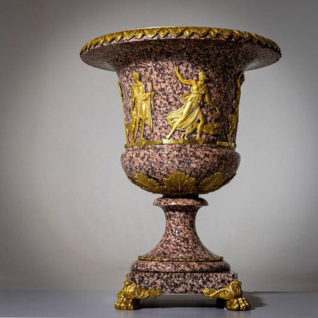Large vase made of red granite with fire-gilded bronze mountings standing on lion paws.