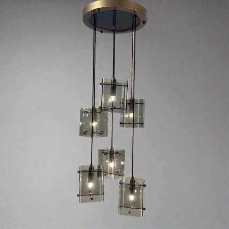 An Italian six light pendant chandelier. Smoked glass, ebonized wood and brass details.
