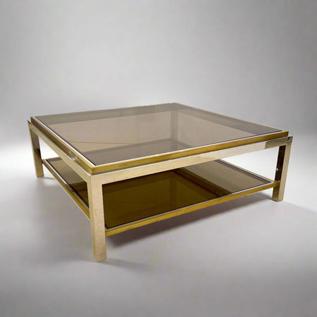 A large Modernist two tier coffee table designed by Jean Charles from France circa 1970. Polished nickel and patinated brass details with smoked glass. Signed: Jean Charles