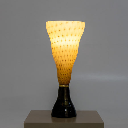 This striking funnel-shaped table lamp from the Vivia Collection features a distinctive amber color with dot decoration. It stands on a dark base with a gold-plated ring mount, adding a touch of elegance. The lamp is marked with the Leucos label on the base. Designed by R. Toso, N. Massari & Associati, this piece exemplifies the innovative and artistic approach of 1990s Italian design, making it a perfect addition to any modern or contemporary decor.