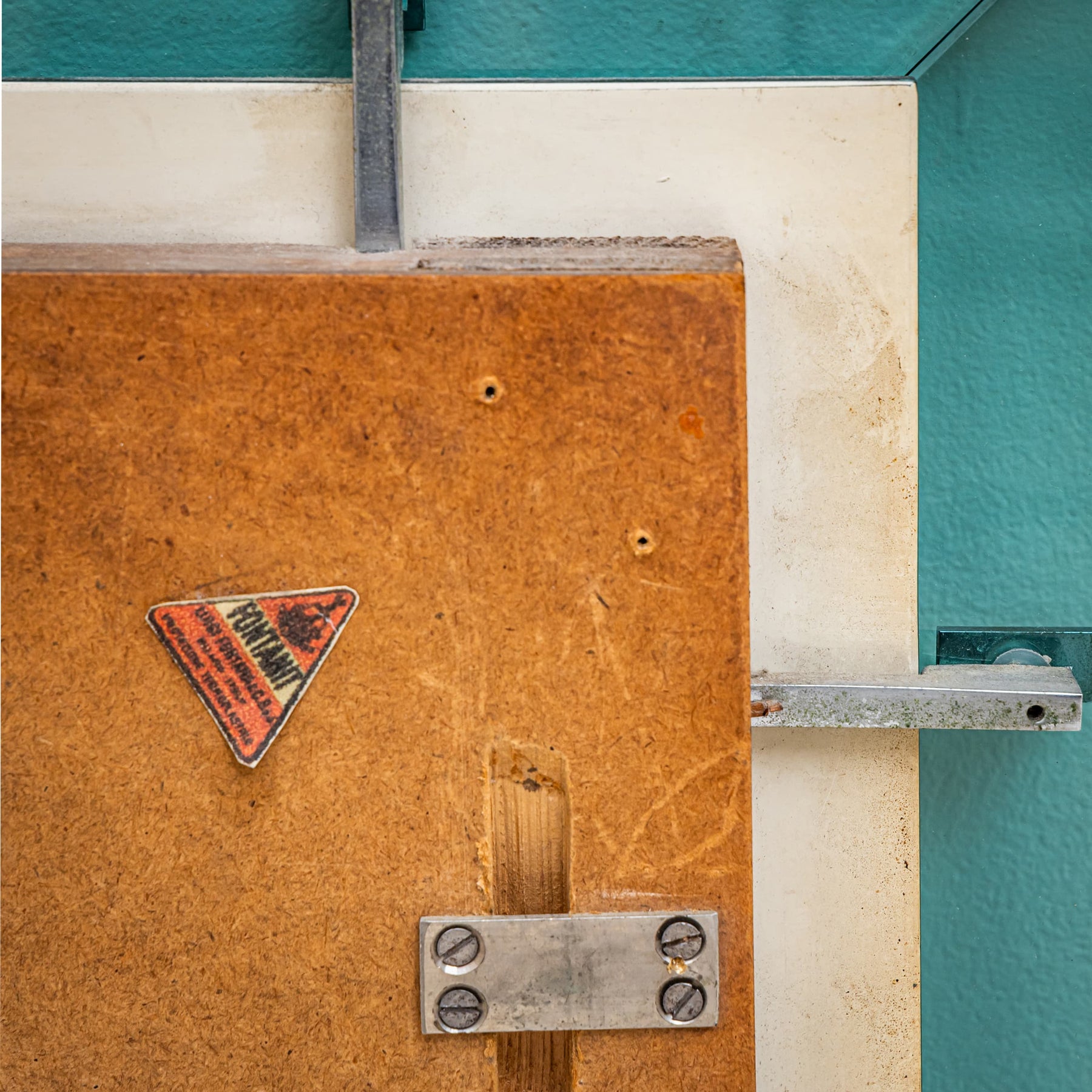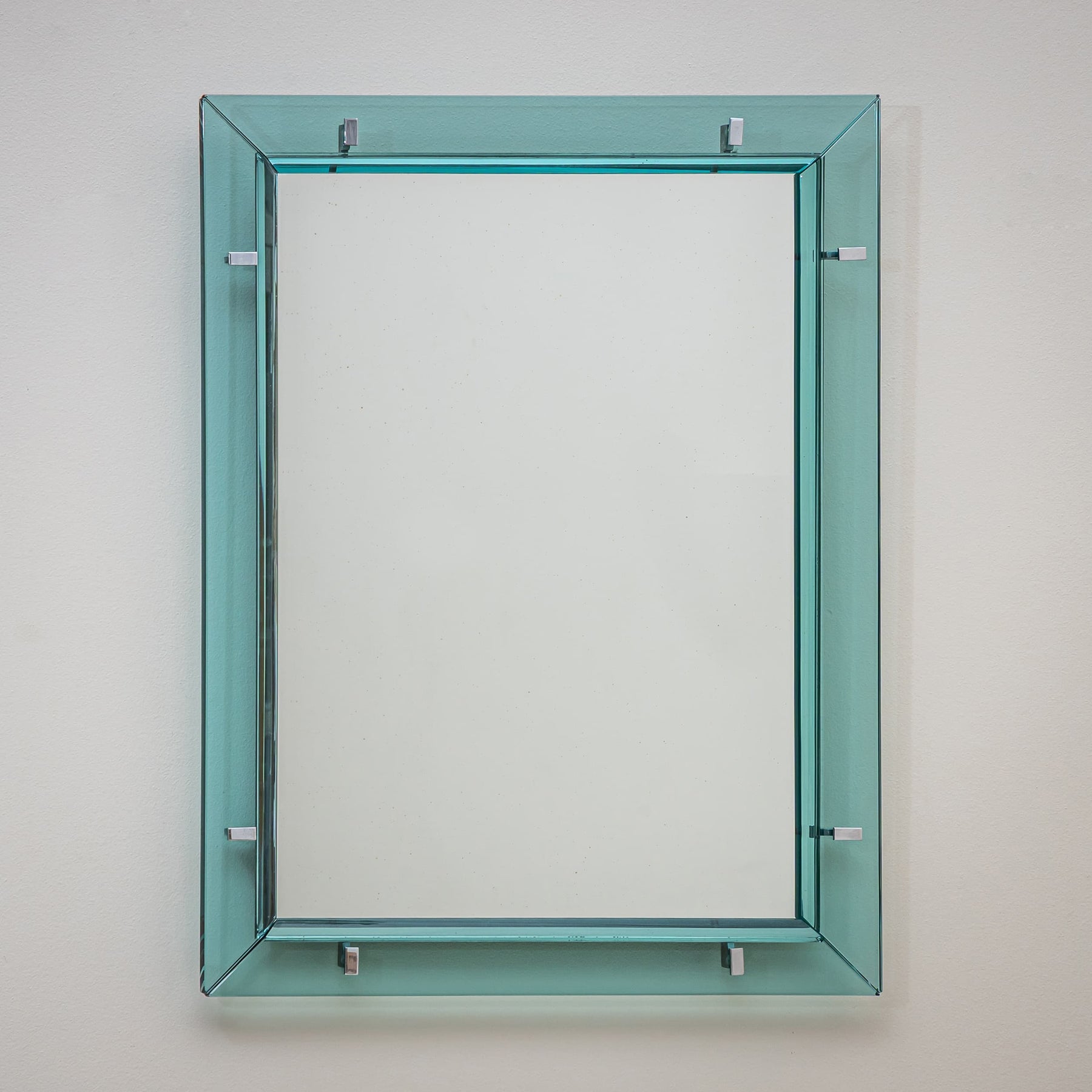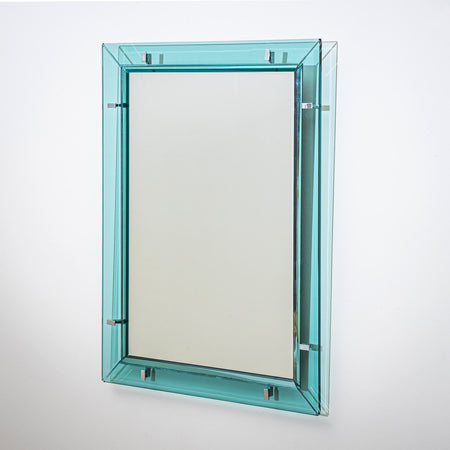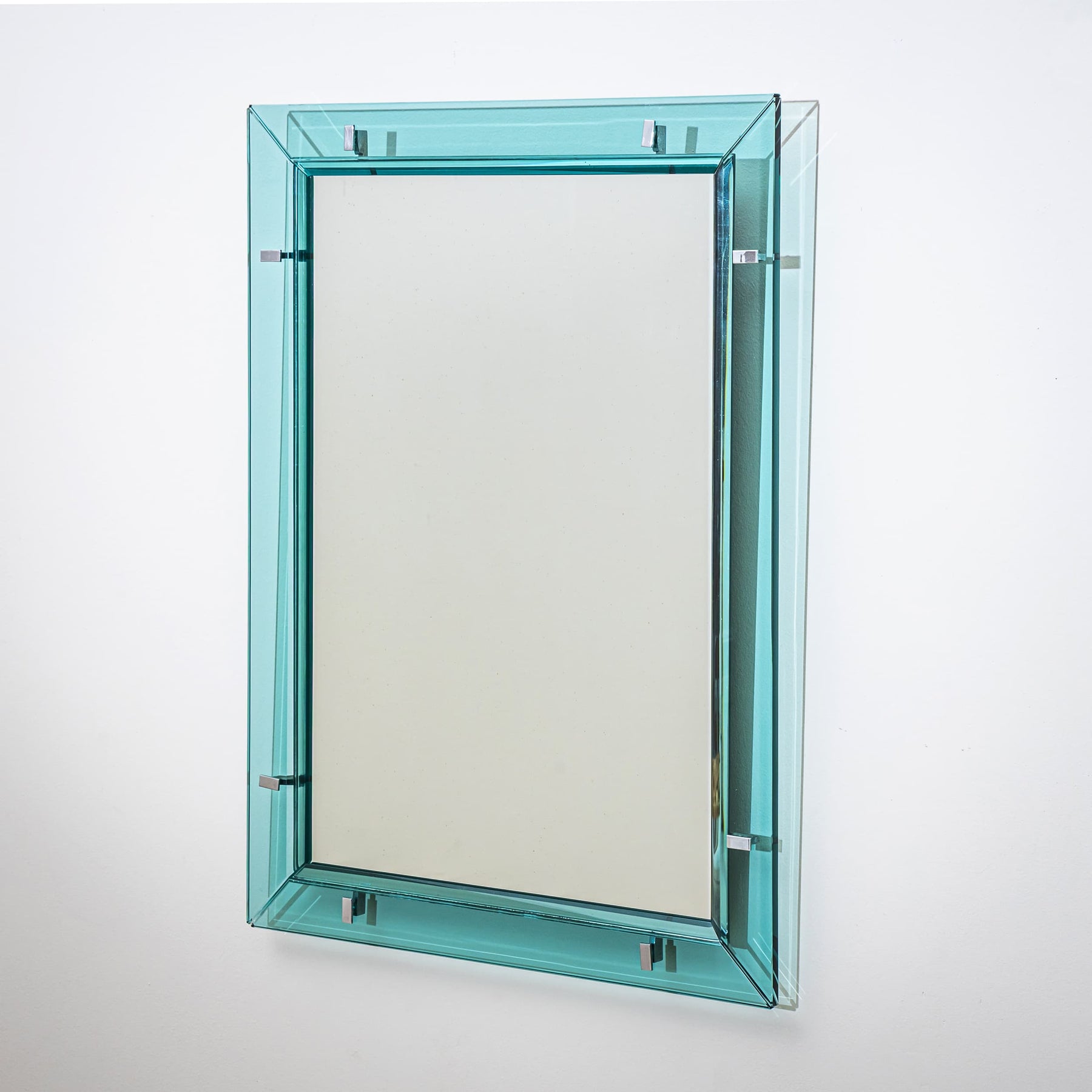 Rectangular wall mirror with a light blue transparent glass frame featuring a faceted inner edge. The piece exemplifies the refined and understated aesthetic characteristic of Max Ingrand’s designs for Fontana Arte during the 1950s. Original manufacturer’s label on the reverse: “FONTANIT – Luigi Fontana & C., Milano.”