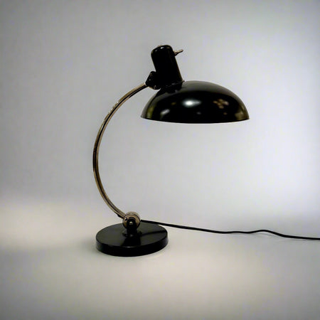 Desk lamp in the style of Christian Dell. Pivoting black painted steel shade with a brass turn switch at the top.  The polished nickel articulating stem is mounted to a weighted painted steel base. Electrified for the U.S. market.
