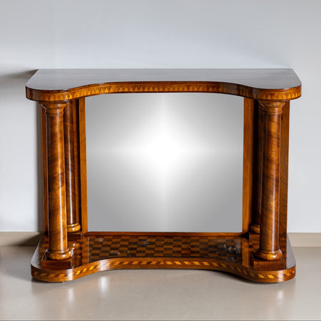 This exquisite mid-19th century console table feature mirrored back panel and robust full columns at the front, complemented by half columns at the back. The gracefully curved top panels mirror the design of the base and are adorned with elegant inlaid edges. The base showcases a striking chequerboard parquetry pattern. Expertly veneered in walnut, this console have been meticulously restored and polished by hand, preserving its historical charm and enhancing its beauty.