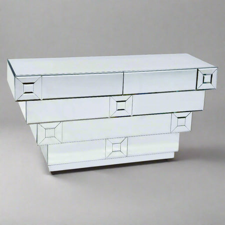 Chest of Drawers in a Hollywood Regency style with five drawers and a completely mirrored body. The individual mirror panes are elegantly faceted at the edges.