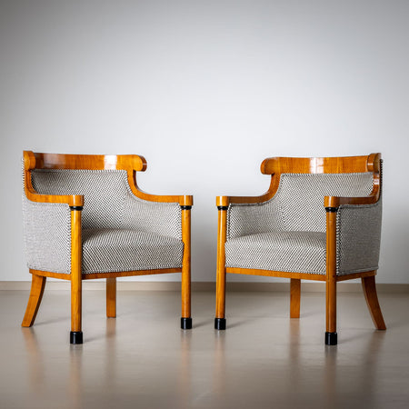 Pair of Biedermeier armchairs in cherry with column-shaped front legs and flared sabre legs at the back. The chairs have a rounded backrest ending in stylized volutes, which descends in a curve to the armrests. The armchairs are newly covered and upholstered on all sides. The checkered fabric in gray and black is of high quality with a woven texture.