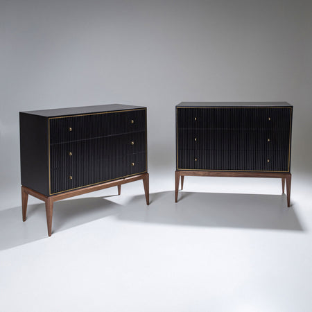 A pair of chests of drawers by Attila Suta, purveyor to the Swedish royal court. The dressers stand on elegant tapering legs made of walnut. Above them rises the three-drawer, ebonized body with a grooved front and brass molding. The company's brand, Attila Suta, can be found on one of the drawers. The furniture is made using the finest materials and the highest quality standards. Since 2013, Attila Suta has held the Royal Warrant, - royal court supplier.