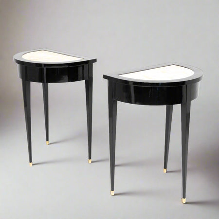Pair of Ebonized Neoclassical Demi Lune Marble Top Consoles.