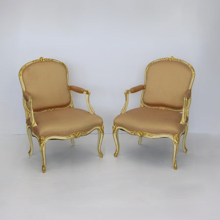 A fine pair of Louis XV first revival armchairs. Polychromed in Ivory with fine gilt carved details.