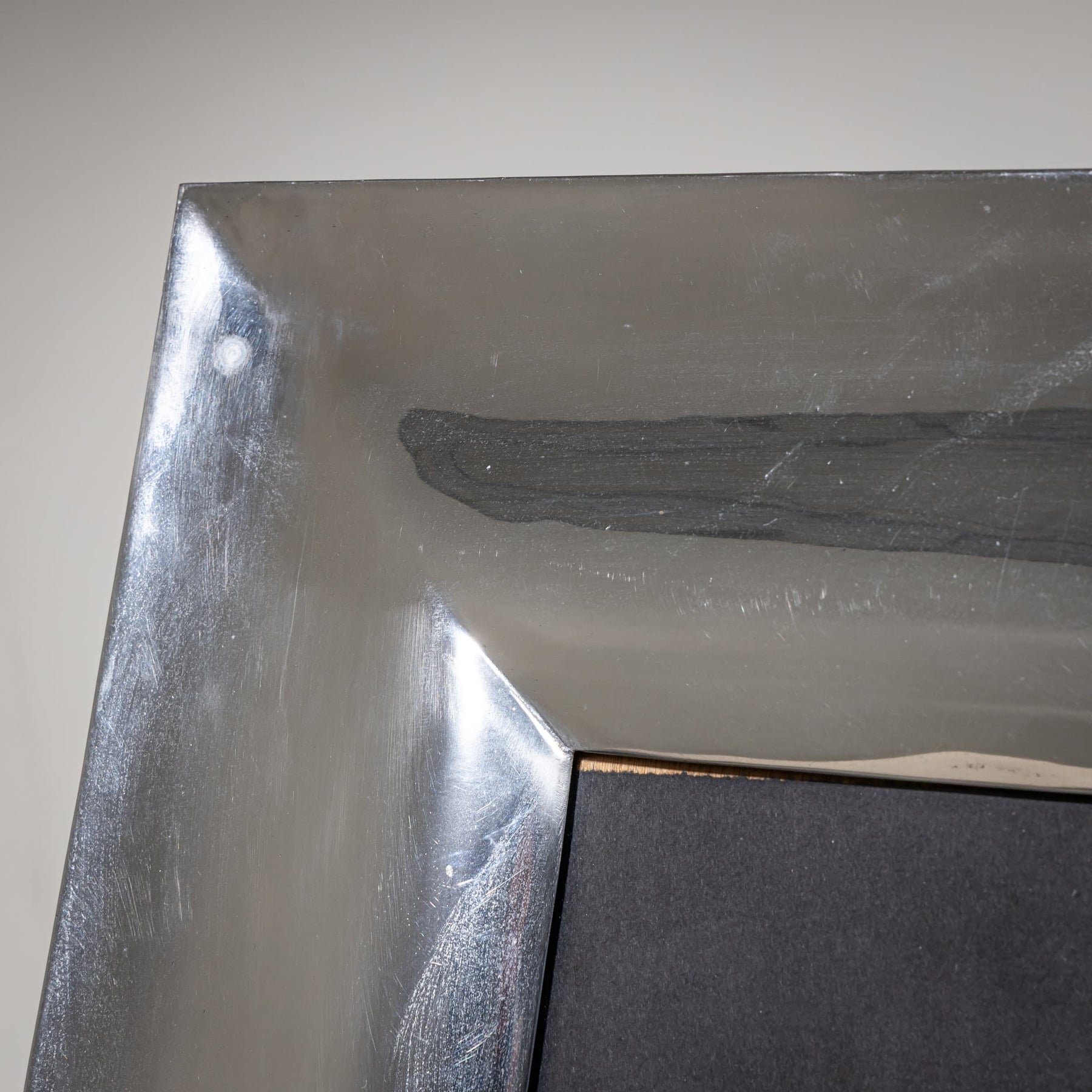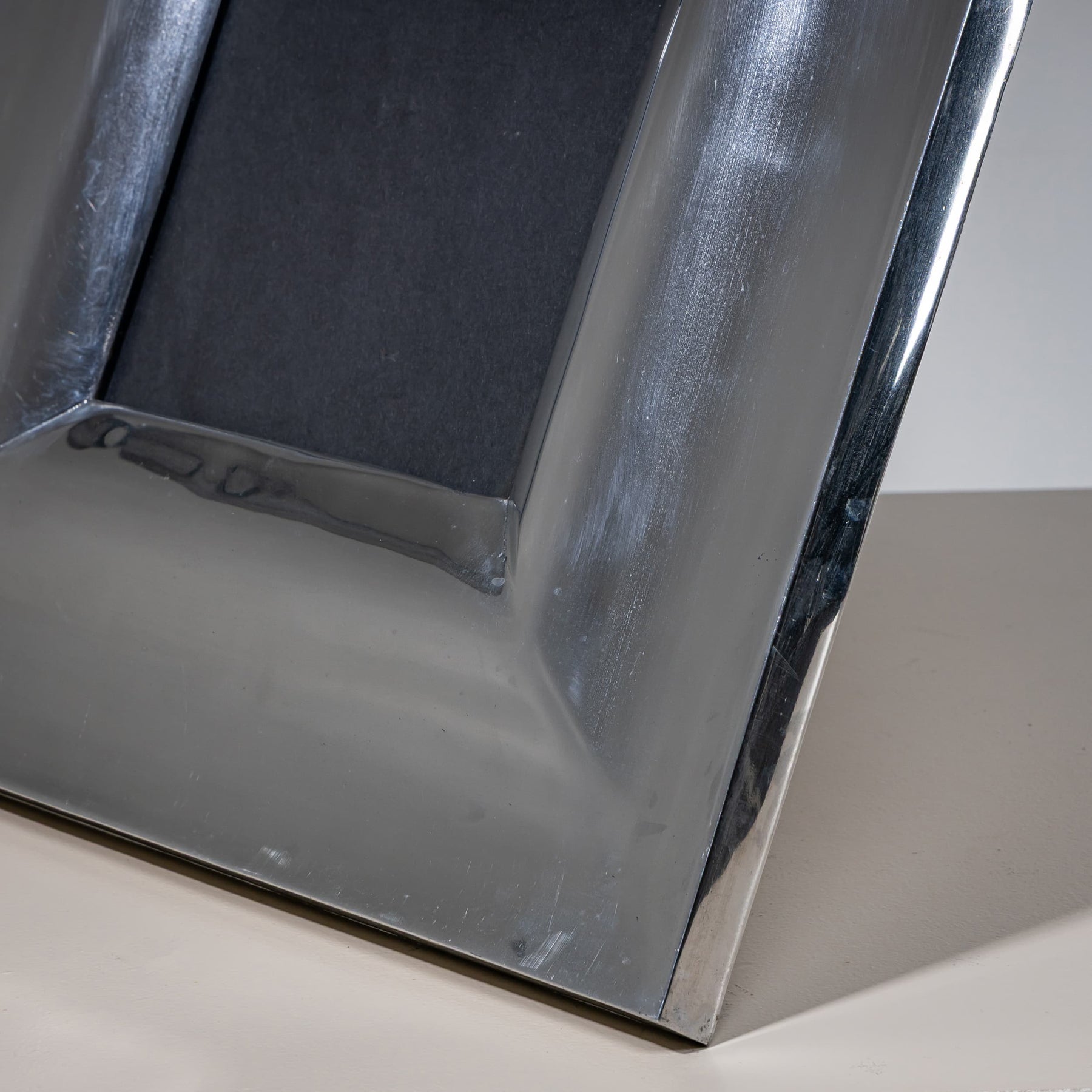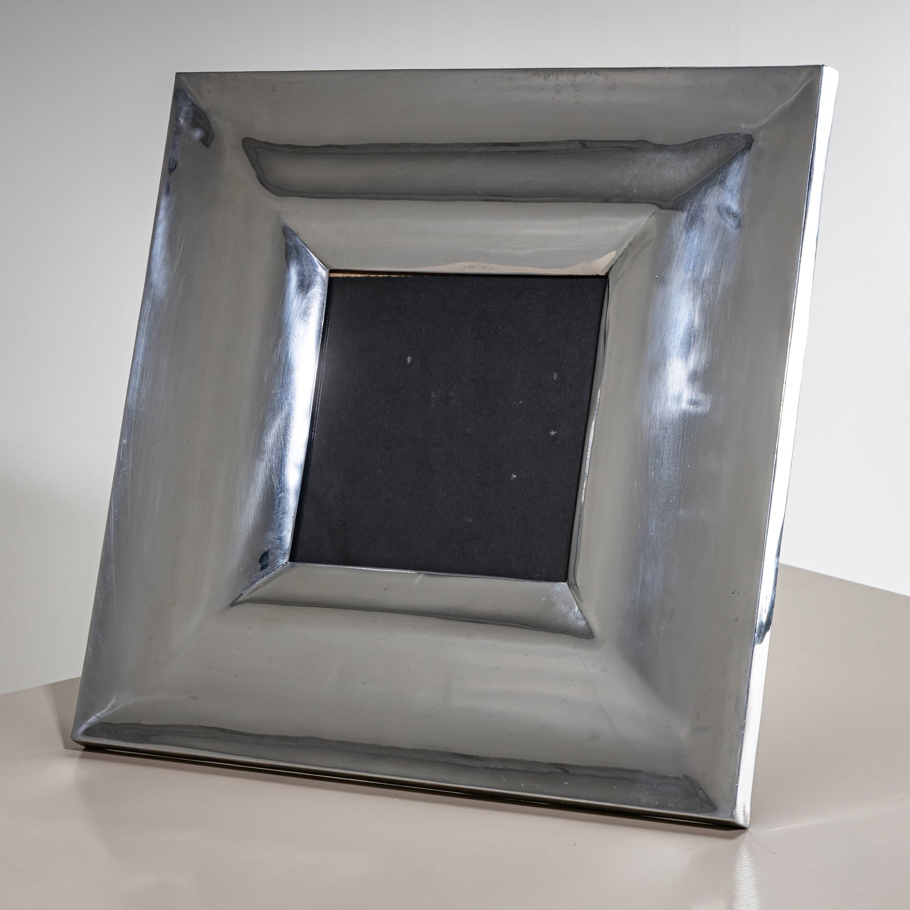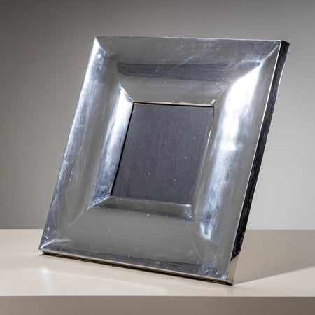 Large tabletop picture frame with a back stand and a wide metal border featuring a slightly convex surface. A decorative piece that beautifully highlights photographs or small artworks.
