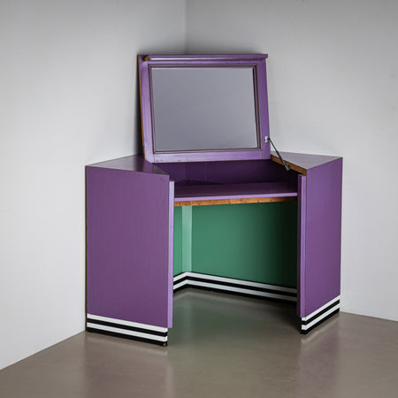 This exceptional corner desk from Italy features a hinged central compartment and a striking color scheme in complementary shades of violet and green, giving the piece a vibrant, pop-inspired appearance. The black-and-white striped base provides a stable foundation, completing the design-oriented ensemble.