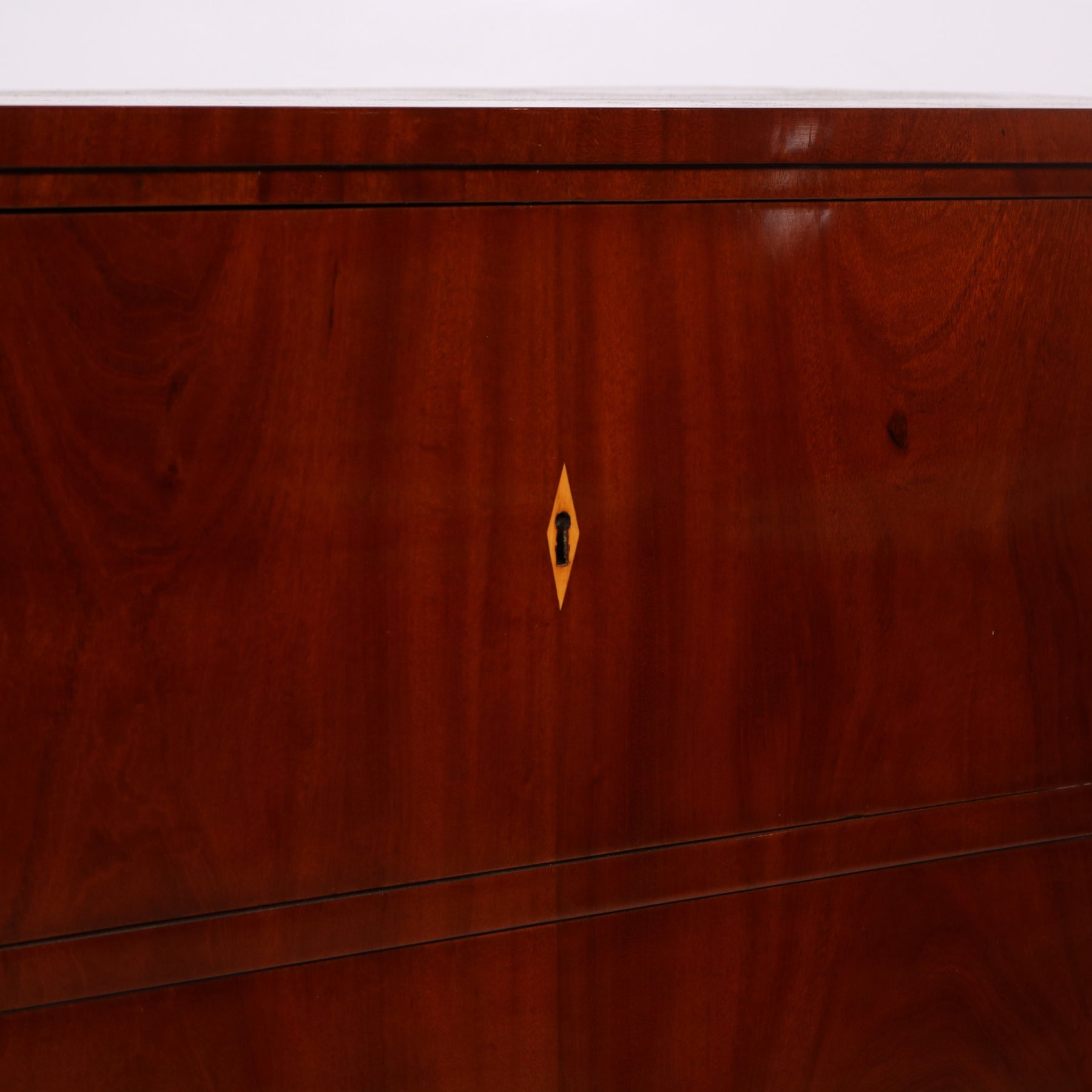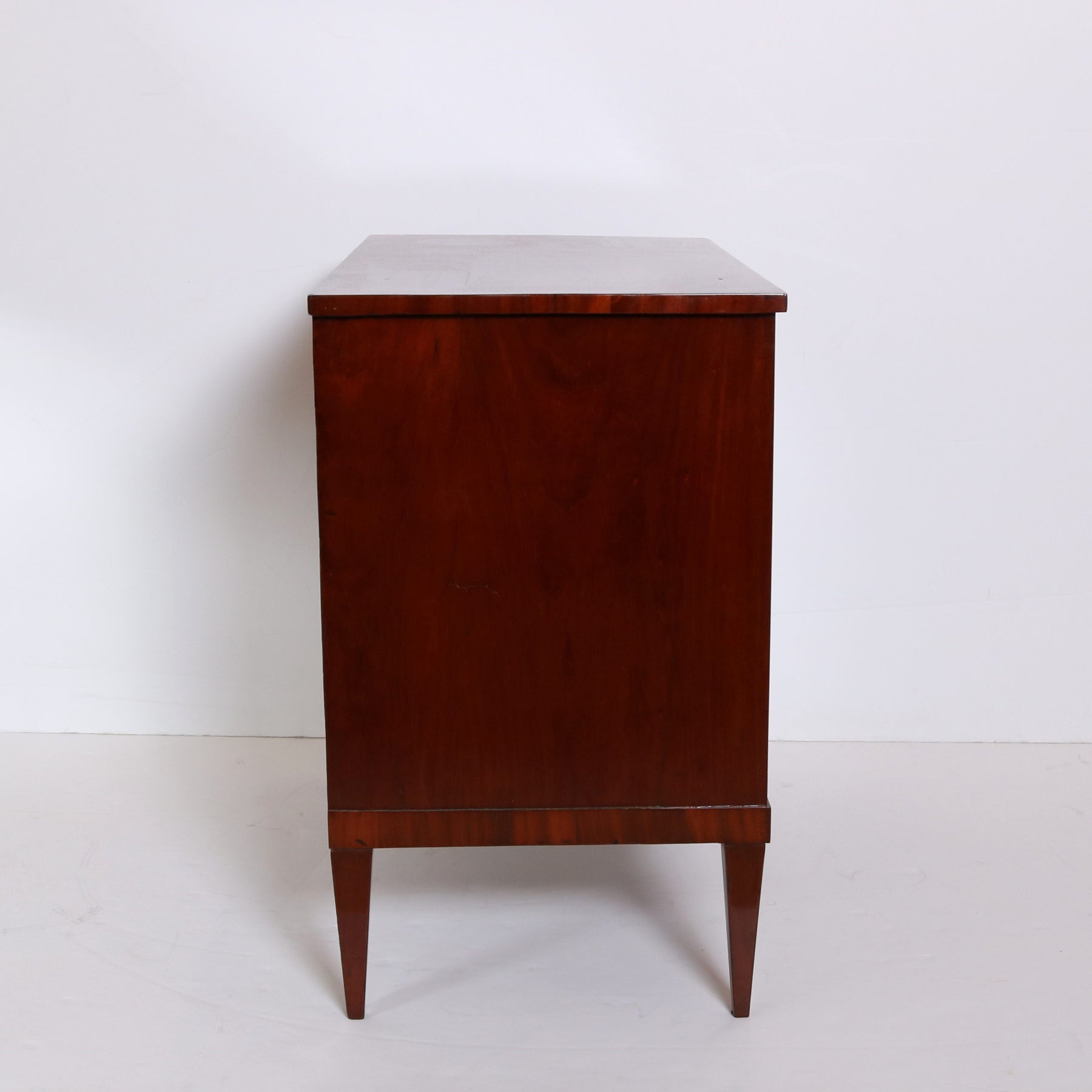 A fine Austrian Biedermeier period chest of drawers from Austria circa 1830. The gorgeous mahogany timber used to sheathe the entire surface of this antique chest is particularly luminous with its distinctive grain pattern. Please note how the vertical band of fruitwood that frames the two drawers gives the chest a rather contemporary effect. The four tapered legs that elevate the body of the chest give the diamond shaped escutcheons (lock covers) their consistent design. Perfectly sized for a bedside or sofa placement in an interior.