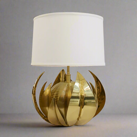 Single Italian Mid-Century brass table lamp. Central patinated brass sphere with horizontal banding details surrounded by stylized brass leaves in three different sizes. Fitted with a white linnen lamp shade.