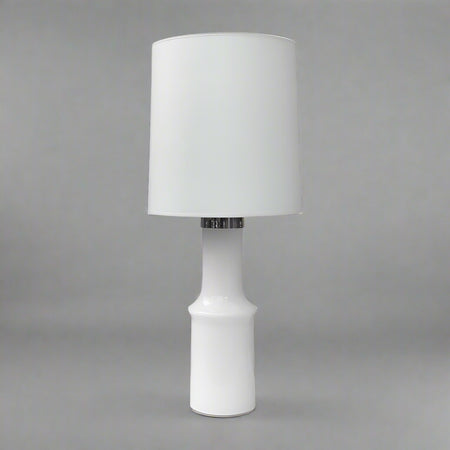 A single Modernist glass table lamp designed by Gert Nystrom for Hyllinge Glassworks. White cased glass with nickel fittings. Scandinavia