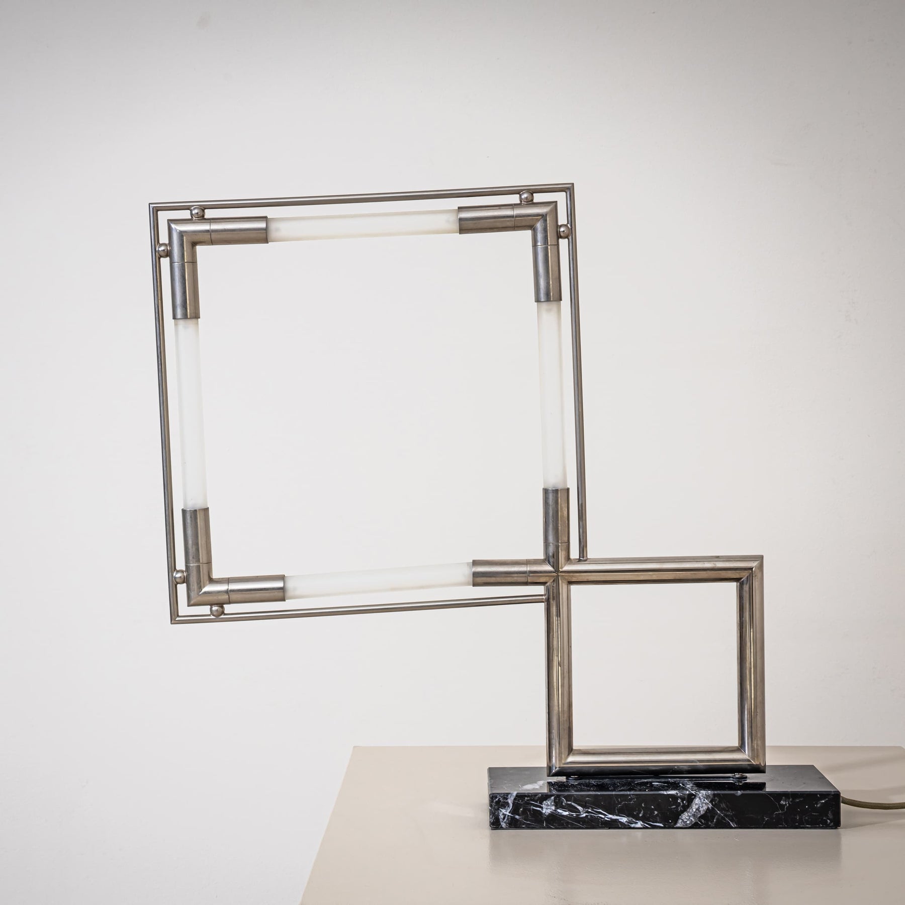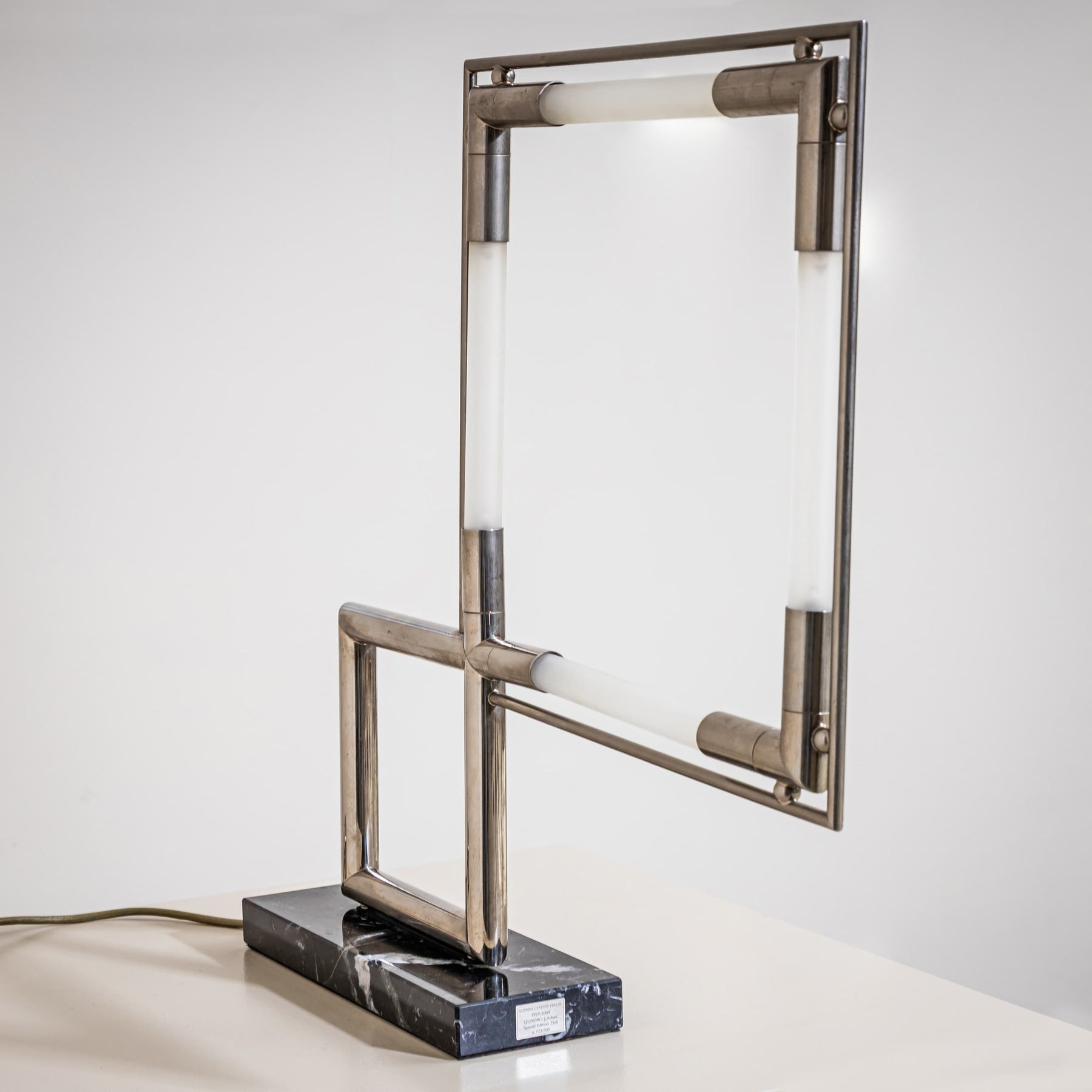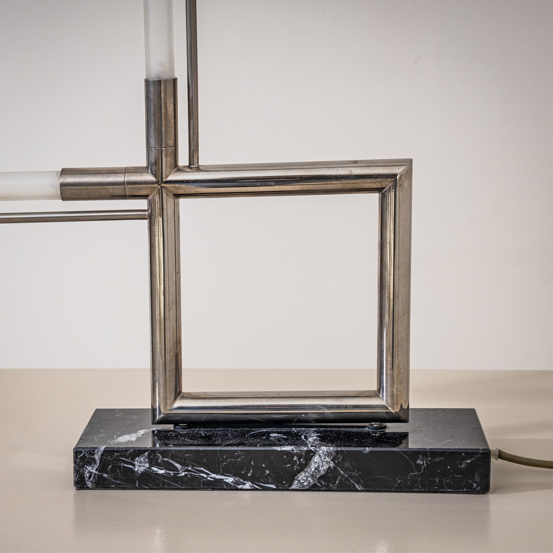 Striking table lamp based on a design by Jacques Adnet, composed of chromed steel tubing with opaque glass inserts forming two intersecting square shapes. The structure is mounted on a black marble base. The original design dates to the 1920s; the present example is a later production from circa 1970. This lamp was produced by Lumen Center Italia as a Special Edition celebrating the company’s 75th anniversary and is numbered 122 of 300. Manufacturer’s plaque affixed to the base.