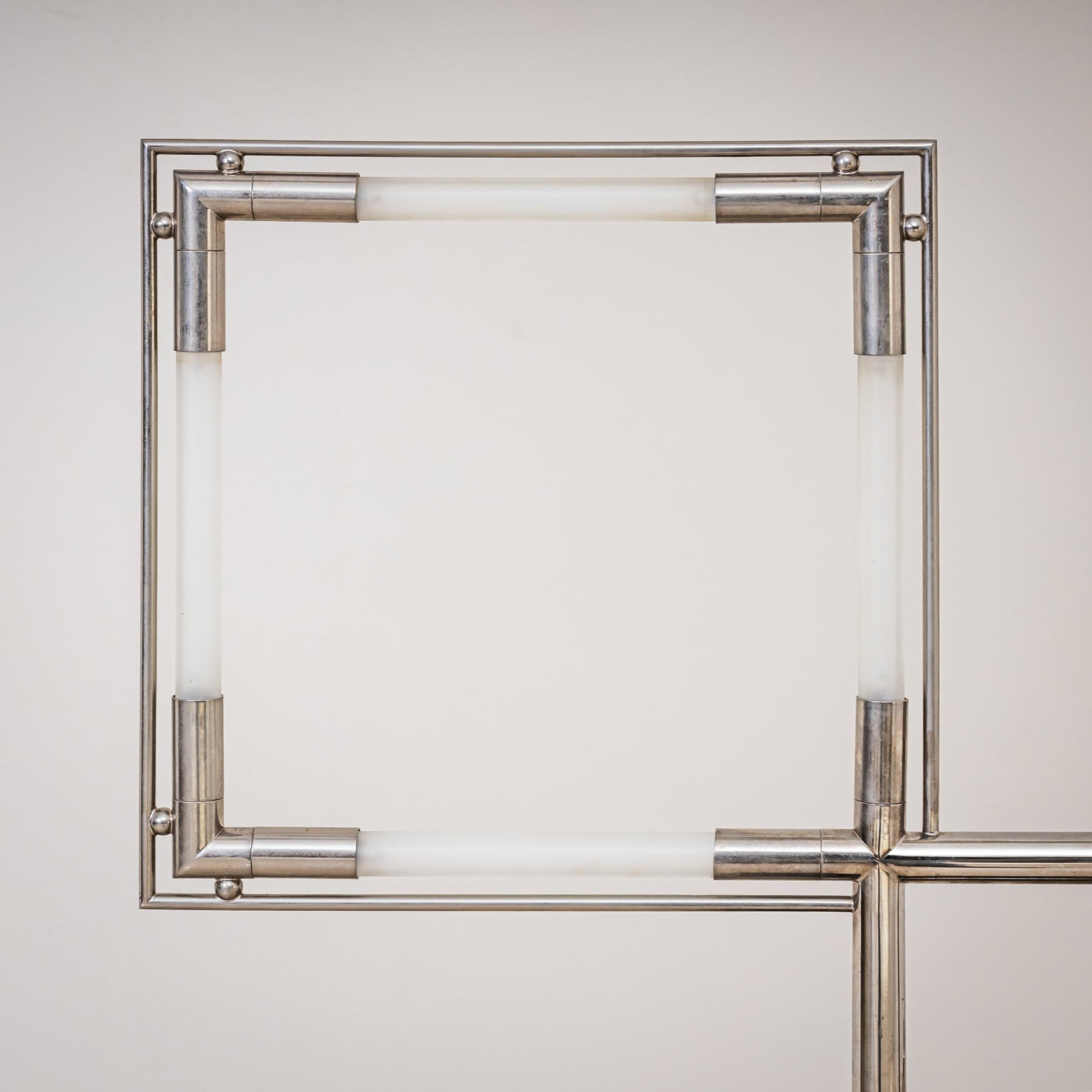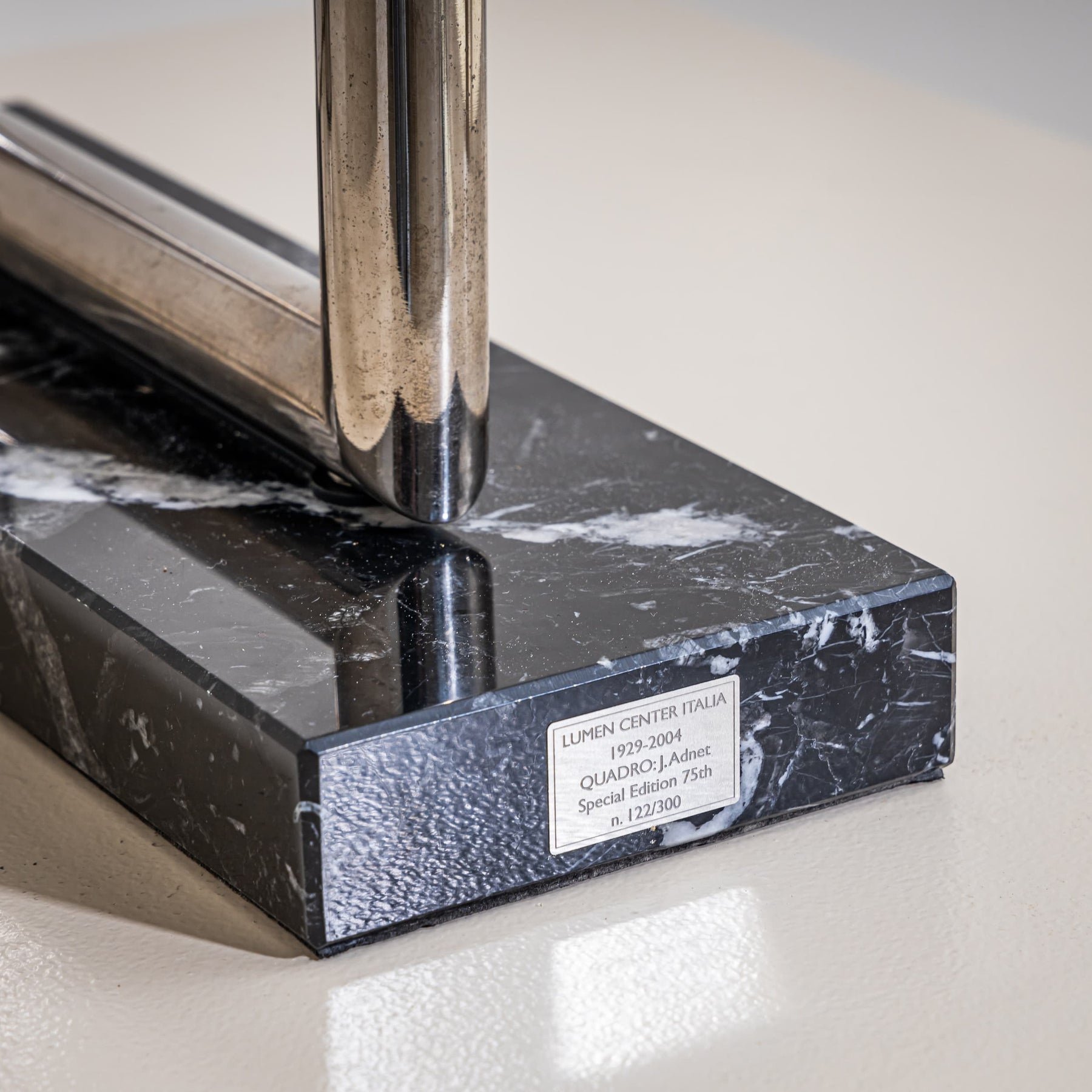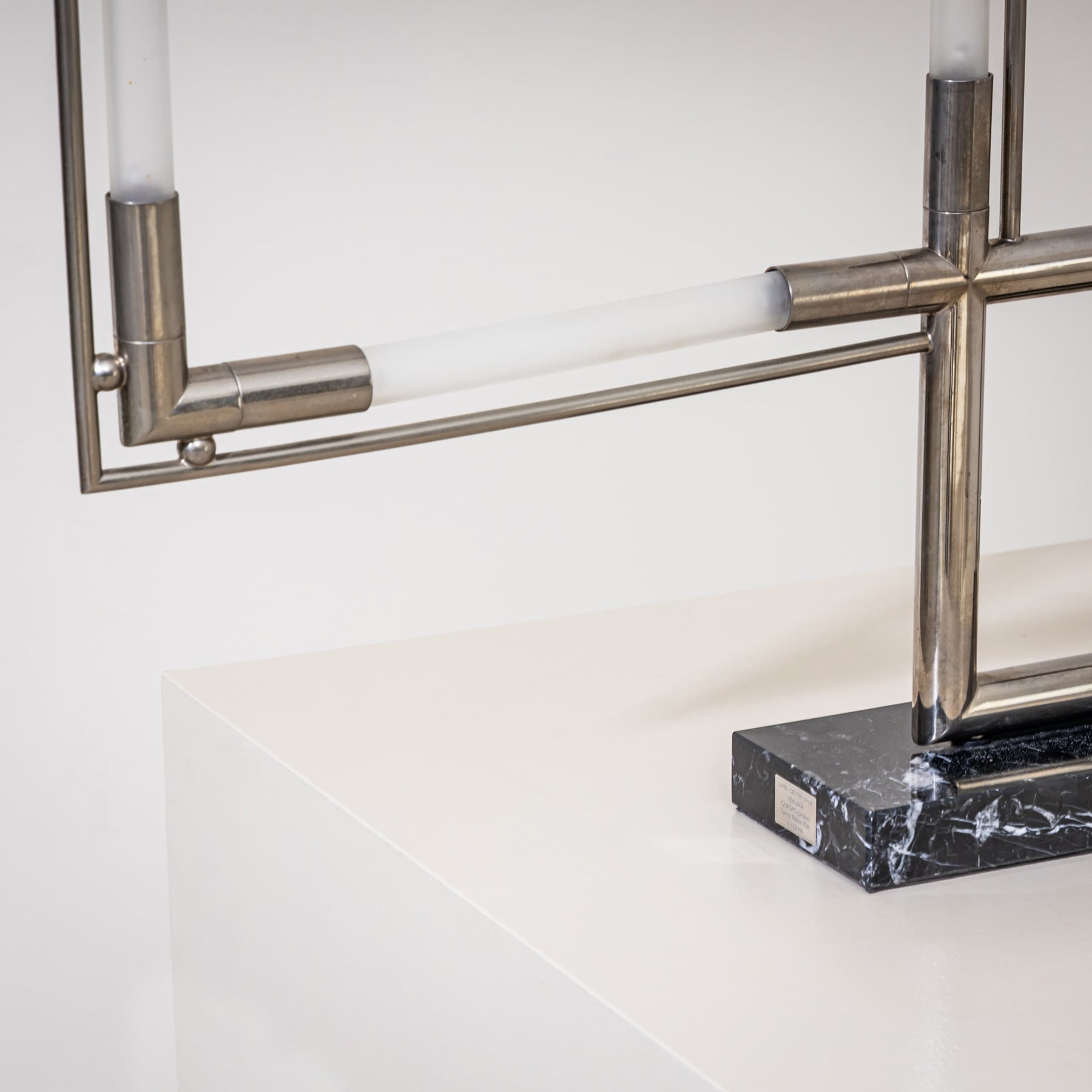 Striking table lamp based on a design by Jacques Adnet, composed of chromed steel tubing with opaque glass inserts forming two intersecting square shapes. The structure is mounted on a black marble base. The original design dates to the 1920s; the present example is a later production from circa 1970. This lamp was produced by Lumen Center Italia as a Special Edition celebrating the company’s 75th anniversary and is numbered 122 of 300. Manufacturer’s plaque affixed to the base.