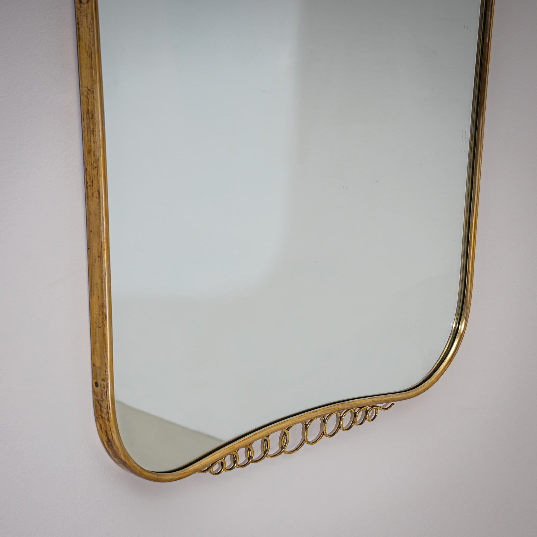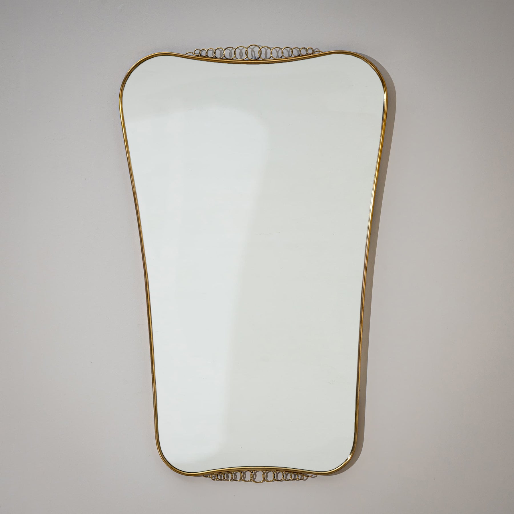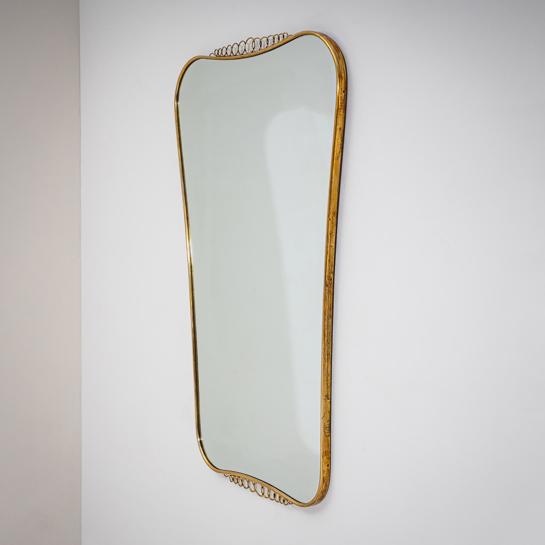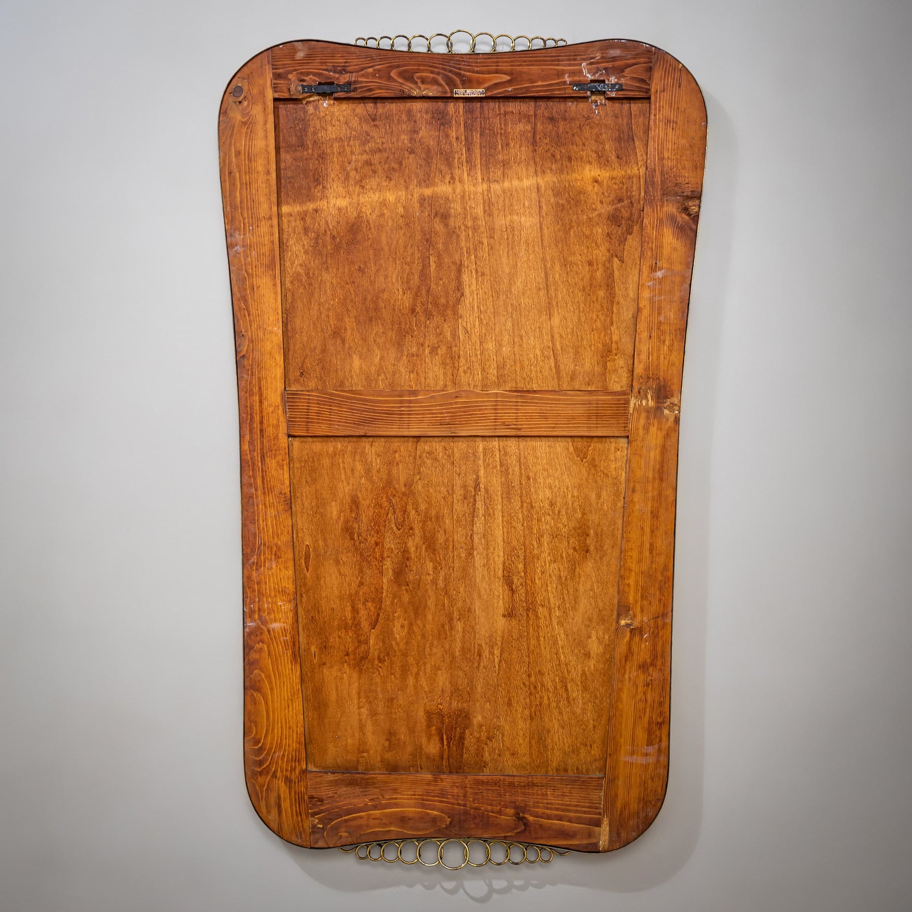 Trapezoidal wall mirror with softly rounded corners and decorative loop motifs along the upper and lower edges. The reverse bears the original label of the firm Luigi Brusotti, Milan.